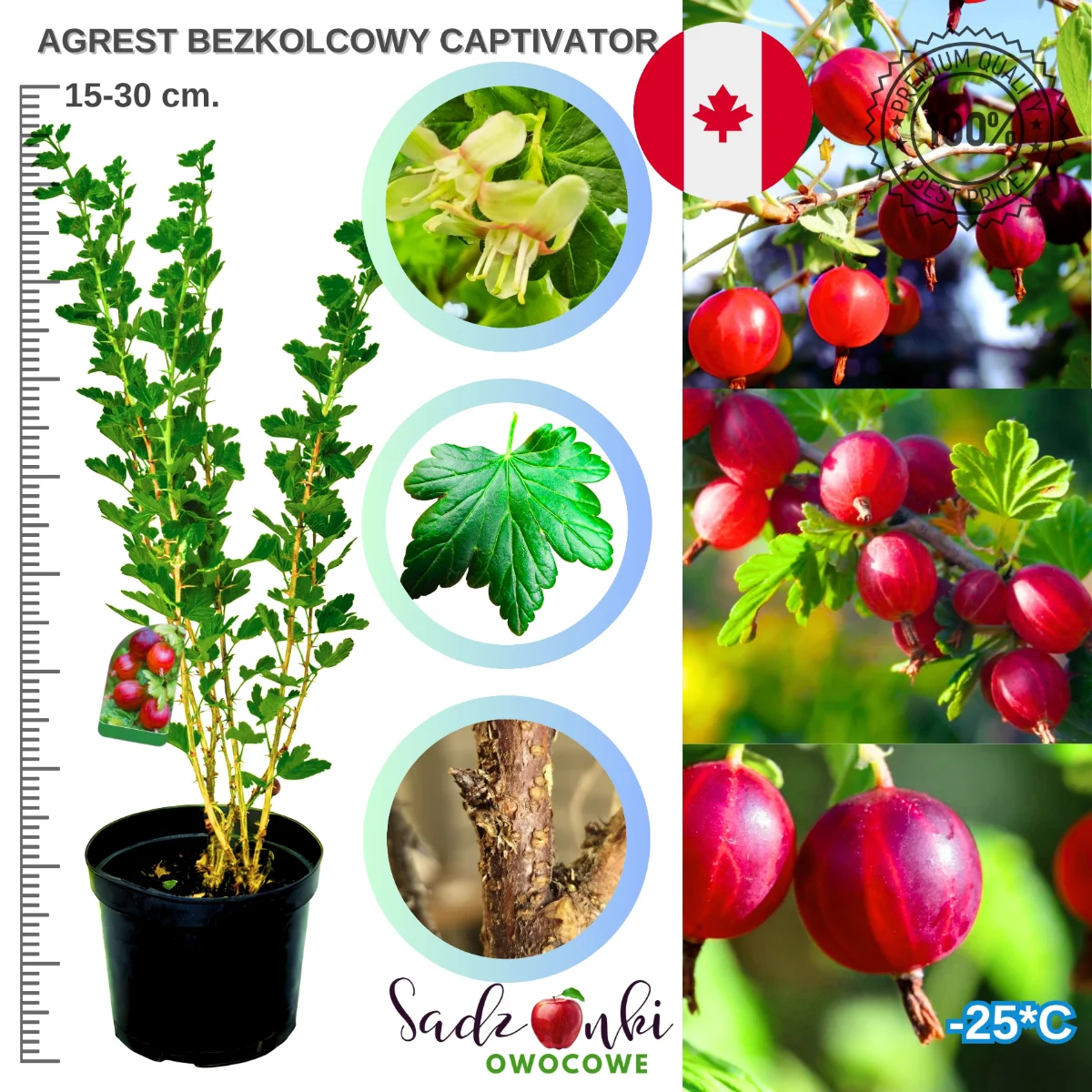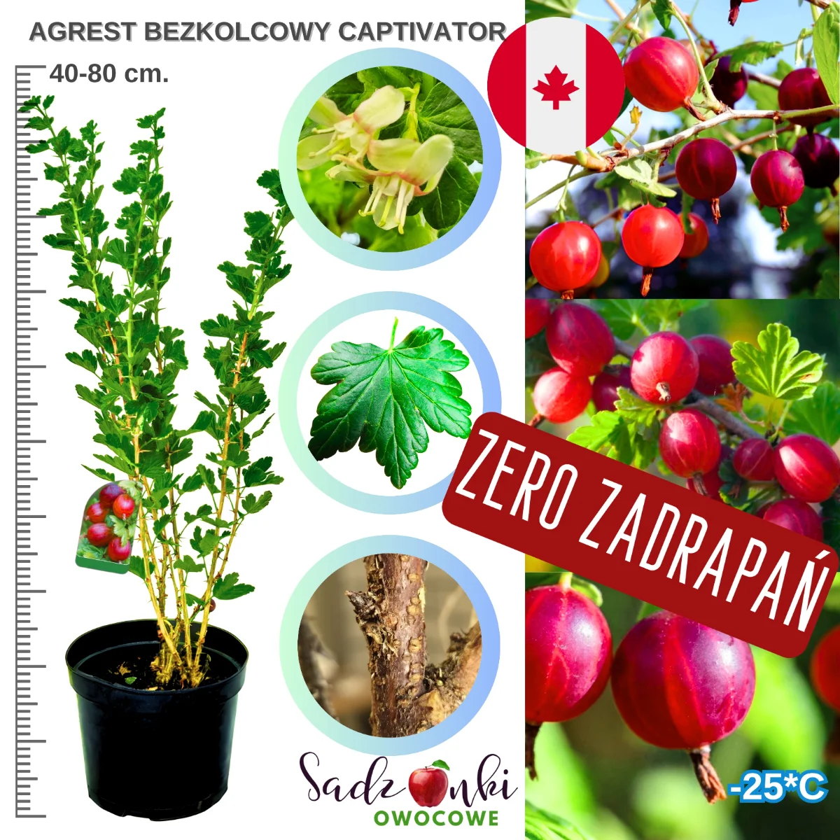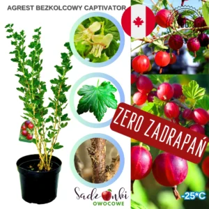Bezkolcowy agrest Captivator to nie tylko praktyczny wybór, ale również elegancka ozdoba każdego ogrodu. Jego zadbane, pozbawione kolców pędy i lśniące, czerwone owoce tworzą atrakcyjną kompozycję, która przyciąga spojrzenia. Dzięki łatwości uprawy i minimalnym wymaganiom pielęgnacyjnym, nawet początkujący ogrodnik osiągnie spektakularne efekty. Nie czekaj na kolejny sezon – już dziś zainwestuj w sadzonkę, która w przyszłym roku zacznie dawać pierwsze owoce, a z czasem obdarzy Cię kilogramami soczystych, zdrowych agreśtów bez kłopotliwych kolców!