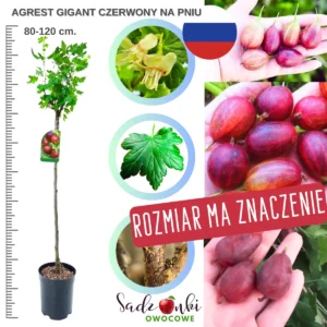 Agrest olbrzymi na pniu czerwony to wyjątkowa propozycja dla osób, które chcą połączyć dekoracyjny wygląd drzewka z obfitym plonowaniem dużych, czerwonych owoców. Forma pienna sprawia, że roślina prezentuje się elegancko, zajmuje mało miejsca i jest wygodna w pielęgnacji oraz zbiorze.