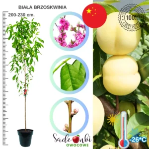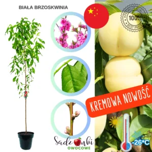 Biała brzoskwinia to jedna z najbardziej cenionych grup odmian deserowych, wybierana przez osoby, które w ogrodzie szukają nie tylko owoców, ale także jakości, estetyki i przewidywalnych efektów uprawy. Jej znakiem rozpoznawczym jest jasny, kremowy miąższ, delikatna słodycz oraz subtelny aromat, który wyraźnie odróżnia ją od klasycznych żółtych brzoskwiń. To propozycja dla tych, którzy chcą mieć w ogrodzie drzewko owocowe o łagodnym charakterze, stabilnym wzroście i wysokiej wartości użytkowej.