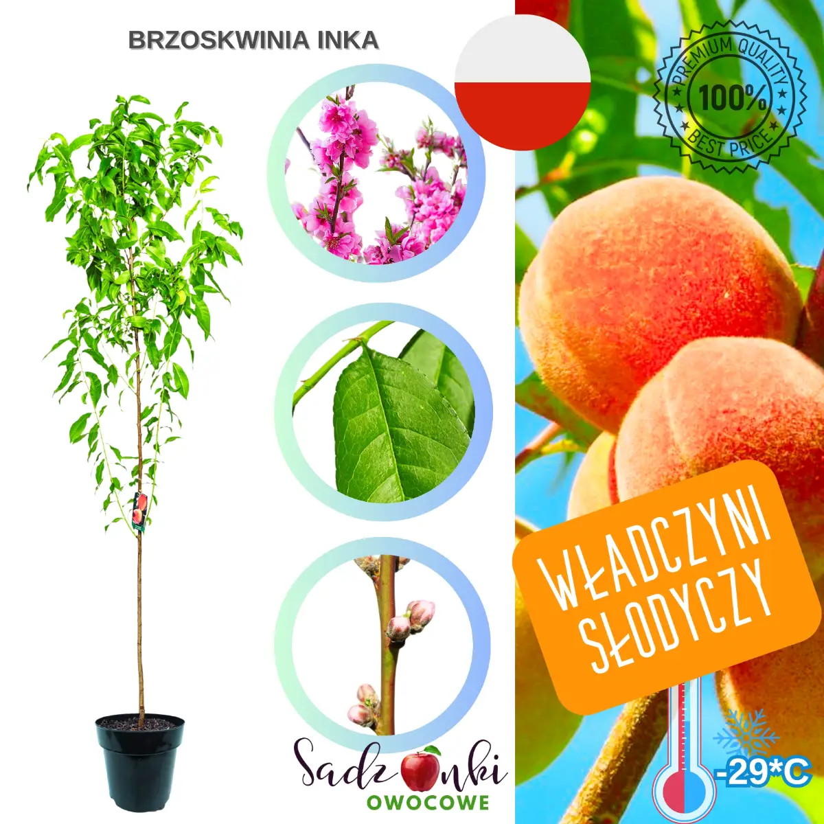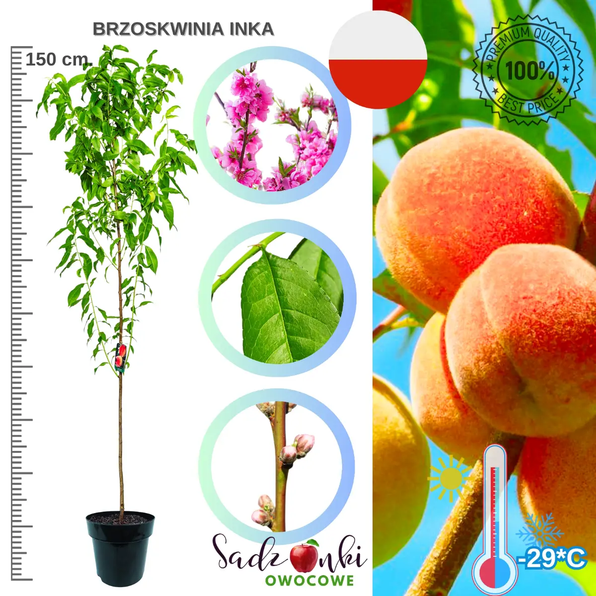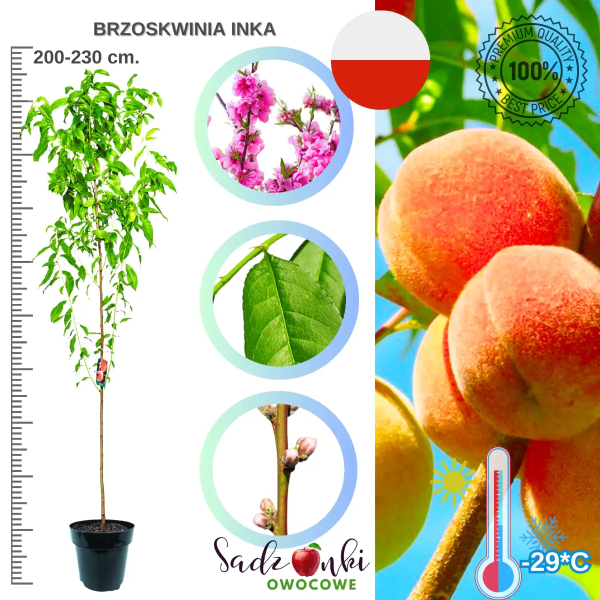 Brzoskwinia Inka to odmiana o wyjątkowo wysokiej odporności na mróz, stabilnym owocowaniu i bardzo dobrych walorach smakowych. Mrozoodporność do −29°C, umiarkowany wzrost oraz uniwersalne zastosowanie owoców sprawiają, że jest to doskonały wybór do ogrodów w różnych częściach Polski. To brzoskwinia dla osób, które chcą mieć w ogrodzie coś więcej niż tylko ładne drzewo – chcą mieć pewne plony przez wiele lat.