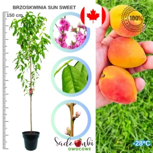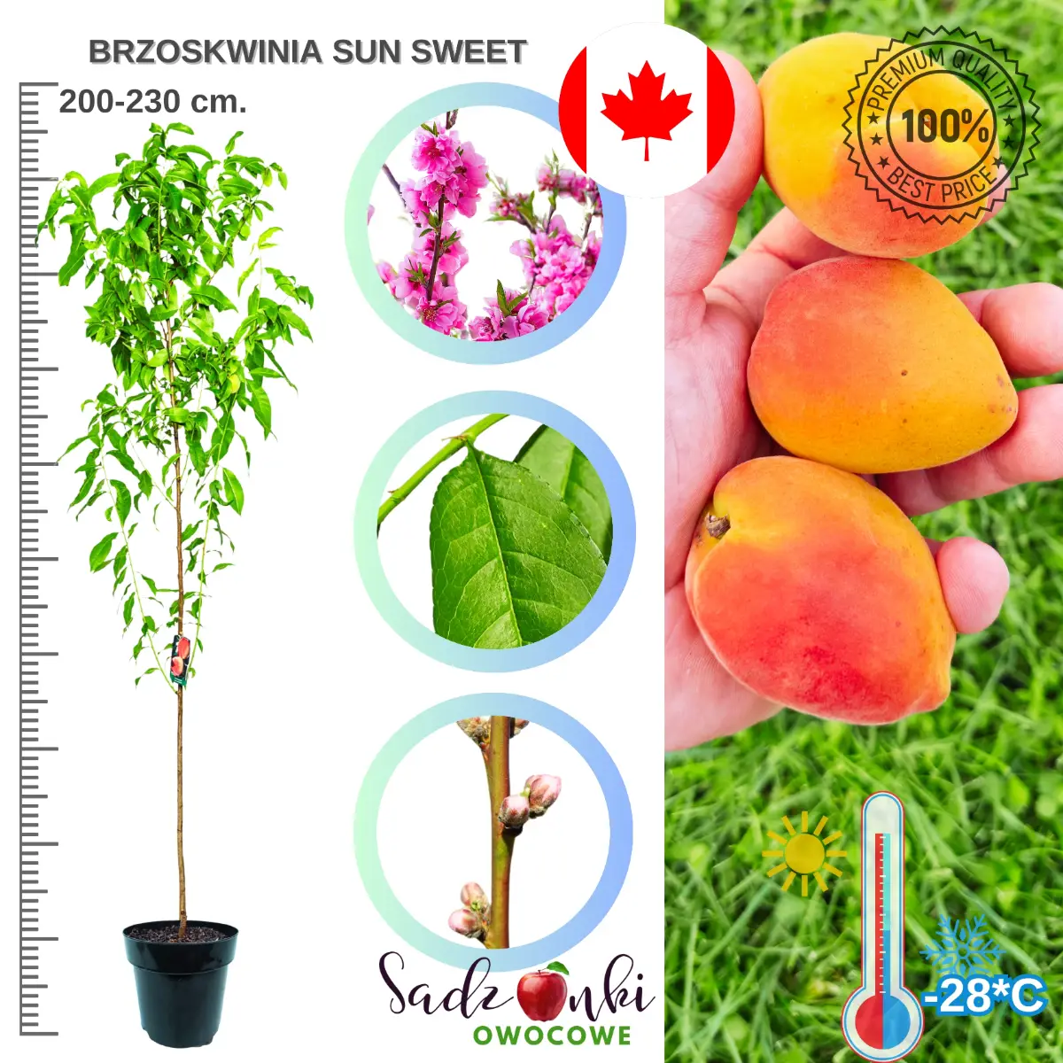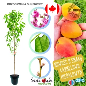 Brzoskwinia Sun Sweet to odmiana, która zachwyca słodyczą, wielkością owoców i intensywnym aromatem. Mrozoodporność do −28°C, wysoka jakość deserowa oraz stabilne owocowanie czynią ją jedną z najbardziej pożądanych brzoskwiń do ogrodu. To propozycja dla osób, które chcą mieć w swoim ogrodzie brzoskwinię absolutnie topową – taką, która naprawdę robi różnicę.