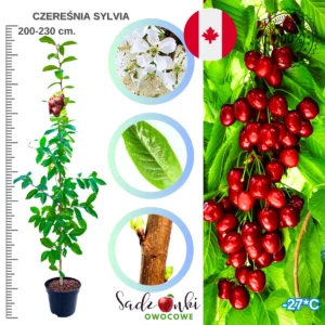 Czereśnia Sylvia to ceniona kanadyjska odmiana, która podbiła serca polskich sadowników i ogrodników. Jej duże, soczyste, ciemnoczerwone owoce o błyszczącej skórce zachwycają wyjątkowo słodkim, jędrnym miąższem. Drzewo rośnie umiarkowanie, tworząc zwartą, łatwą do formowania koronę, co czyni je doskonałym wyborem do mniejszych ogrodów i działek. Sylvia szybko wchodzi w okres owocowania, plonując obficie i regularnie każdego roku, dostarczając pysznych owoców na początku lipca. Sadzonka czereśni Sylvia to inwestycja w lata pełne naturalnych, słodkich przyjemności prosto z własnego ogrodu.