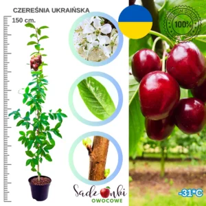 Czereśnia Ukraińska to wyjątkowa odmiana pochodząca z Ukrainy, będąca krzyżówką 'Drogany Żółtej’ i 'Walerija Czkałowa’. Drzewo rośnie średnio silnie, tworząc rozłożystą koronę, co ułatwia zbiór owoców. Owoce są bardzo duże, osiągające masę nawet do 15 gramów, o ciemnoczerwonej, błyszczącej skórce. Miąższ jest jasnoczerwony, słodki, soczysty i chrząstkowaty, co czyni je idealnymi do bezpośredniego spożycia oraz na przetwory. Odmiana ta dojrzewa wcześnie, zazwyczaj w połowie czerwca, co pozwala cieszyć się smakiem lata już na początku sezonu.