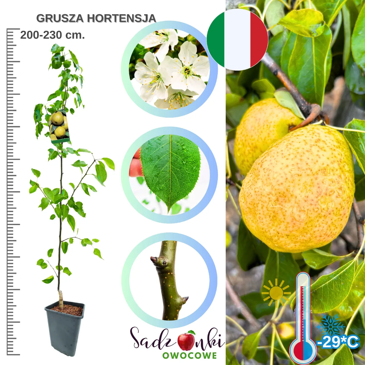 Hortensja to wyjątkowa odmiana gruszy, której korzenie sięgają dawnych, szlacheckich sadów. Ta 150-centymetrowa sadzonka jest spadkobierczynią bogatej tradycji ogrodniczej, łącząc klasyczne walory z wymaganiami współczesnych ogrodników. Nazwa odmiany nie jest przypadkowa – dojrzałe owoce wydzielają subtelny, kwiatowy aromat przypominający zapach hortensji, co stanowi ich unikatową cechę. Grusza Hortensja zachwyca również charakterystycznym rumieńcem na żółto-pomarańczowej skórce, który pojawia się przy pełnej dojrzałości owoców. Zrównoważony smak – słodki z delikatną kwasowością – sprawia, że owoce są uwielbiane zarówno przez dzieci, jak i dorosłych koneserów.
