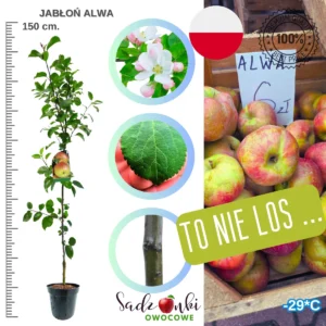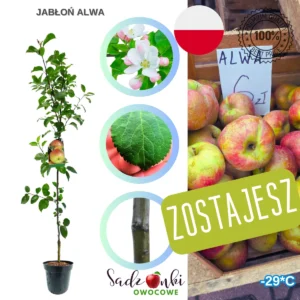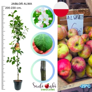 Jabłoń Alwa to ceniona odmiana o wyjątkowo smacznych, słodko-kwaśnych owocach. Jej duże, czerwone jabłka wyróżniają się soczystym miąższem i aromatem, dzięki czemu świetnie nadają się zarówno do bezpośredniego spożycia, jak i do przetworów. Drzewo jest niezwykle odporne na mróz, wytrzymując temperatury do -37°C, co czyni je doskonałym wyborem dla polskiego klimatu. Dzięki wysokiej plenności i odporności na choroby jabłoń Alwa sprawdzi się zarówno w przydomowym ogrodzie, jak i w sadzie produkcyjnym.