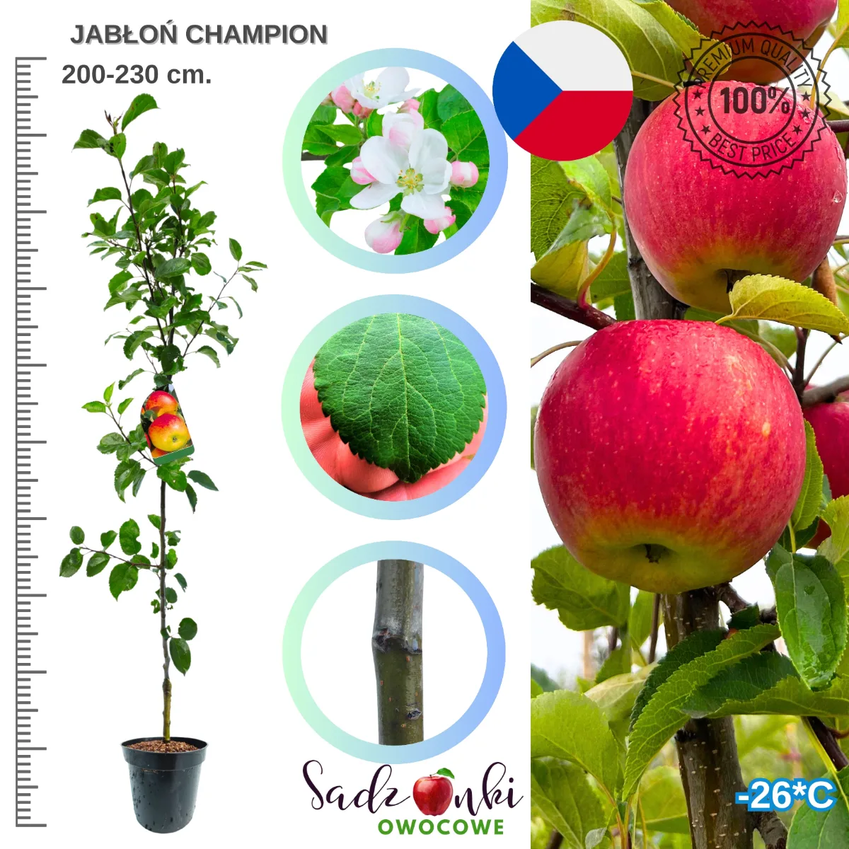 Jabłoń Champion to jedna z najpopularniejszych odmian deserowych, ceniona za swoje wyjątkowo smaczne owoce. Pochodzi z Czech i wyróżnia się regularnym, wysokim plonowaniem. Jej jabłka mają cienką skórkę, soczysty miąższ i doskonały balans między słodyczą a kwasowością. Dojrzewają we wrześniu i mogą być przechowywane aż do lutego. Idealna zarówno do sadów przydomowych, jak i większych upraw towarowych.