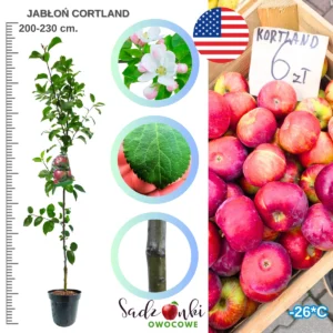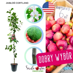 Jabłoń Cortland to ceniona odmiana, pochodząca z Ameryki Północnej, która zyskała ogromną popularność również w Polsce. Słynie z dużych, kulistych owoców o czerwono-zielonej skórce i wyjątkowo aromatycznym, soczystym miąższu. Owoce dojrzewają w październiku i świetnie nadają się zarówno do bezpośredniego spożycia, jak i na przetwory. Dzięki doskonałej mrozoodporności do -38°C, sadzonka świetnie sprawdza się nawet w najchłodniejszych regionach kraju.