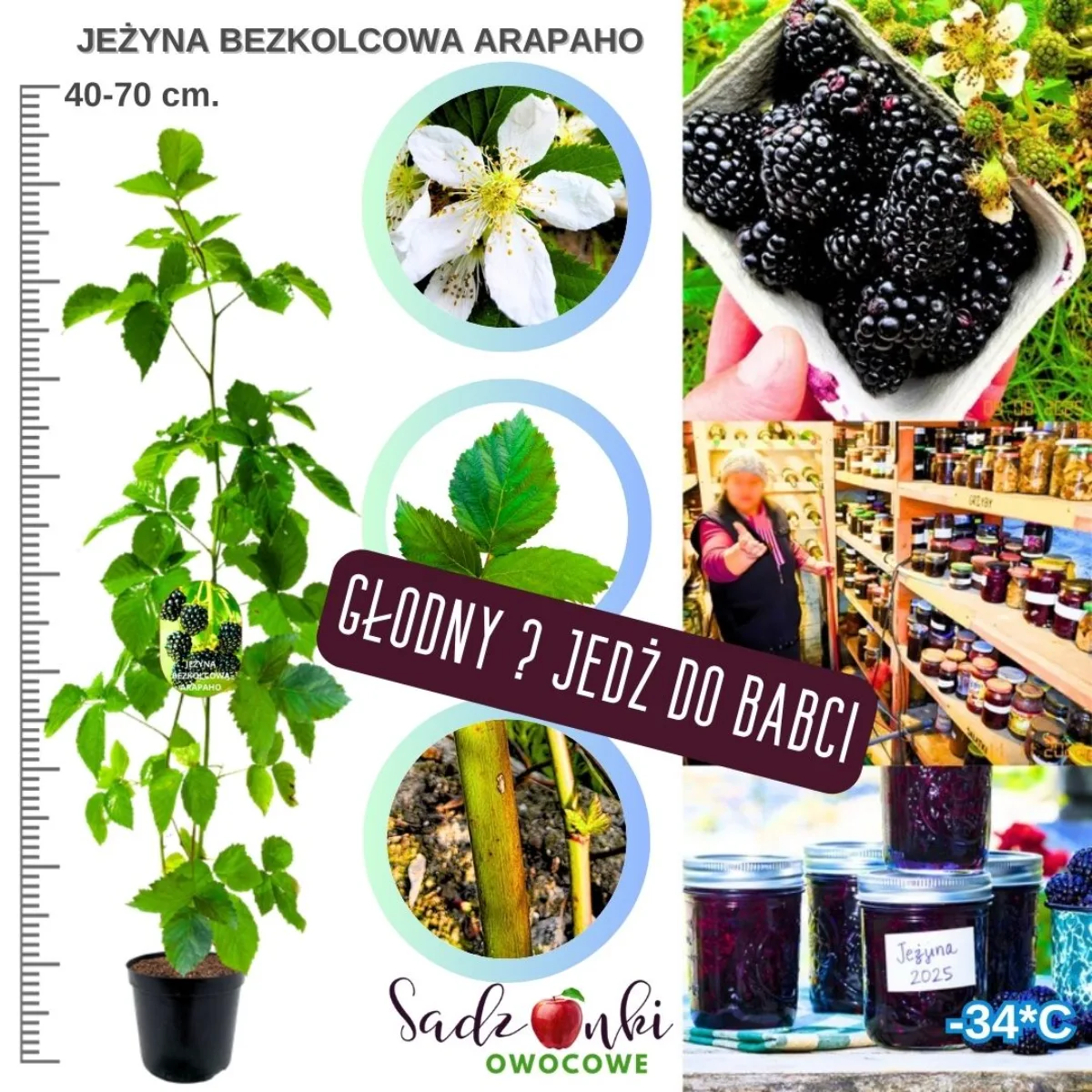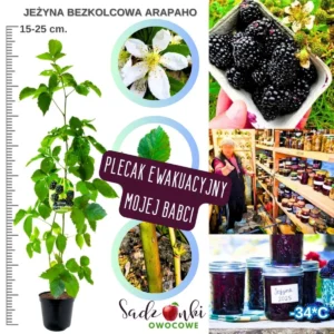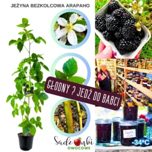 Jeżyna bezkolcowa Arapaho to wczesna, plenna odmiana o dużych, słodkich owocach. Krzew dorasta do około 2–2,5 m, owocuje na pędach dwuletnich i przy odpowiednim prowadzeniu może wydać 6–10 kg owoców z jednej rośliny. Mrozoodporność do –34°C pozwala na bezpieczną uprawę w warunkach klimatycznych Polski.
