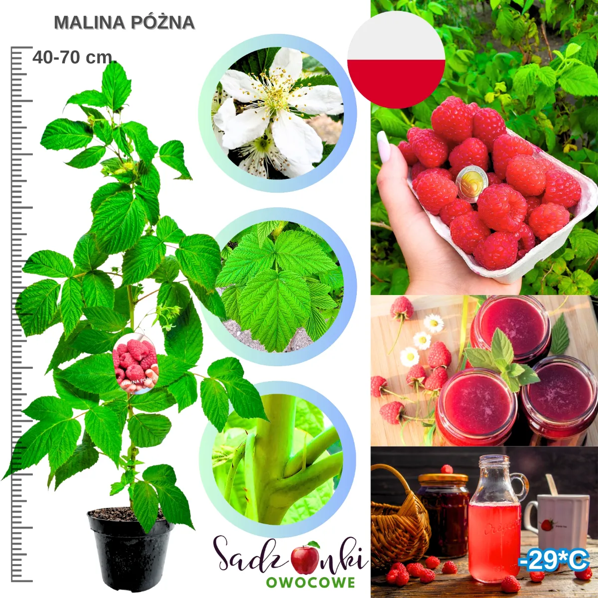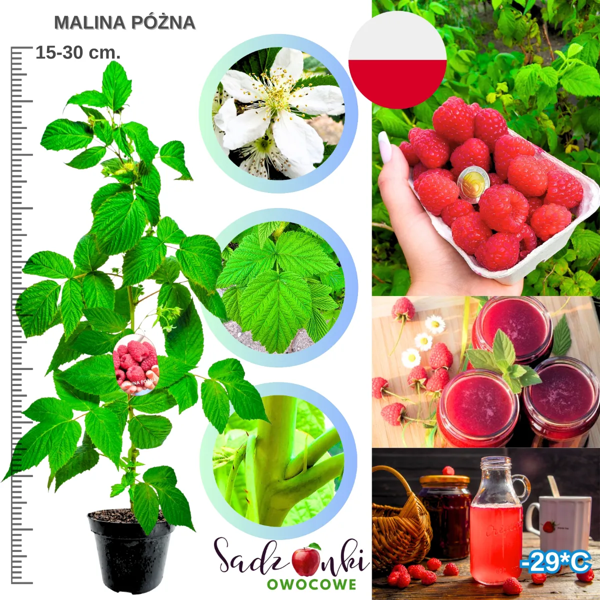 W tej ofercie kluczowe jest jedno: to sadzonki malin nastawione na użytkowy ogród. Czyli nie „ładna roślina do patrzenia”, tylko roślina, która ma dawać realne zbiory, a przy tym dobrze znosić warunki w Polsce. Mrozoodporność tej malinowej sadzonki to do –31°C, więc jest to wybór bez stresu na zimę w większości regionów kraju.