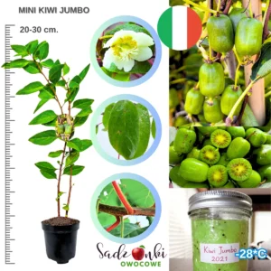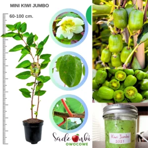 Mini Kiwi Jumbo to energicznie rosnąca odmiana aktinidii przeznaczona do uprawy w ogrodach przydomowych, na działkach oraz przy konstrukcjach takich jak pergole czy ogrodzenia. Roślina łączy w sobie dynamiczny wzrost, wysoką odporność na mróz oraz regularne owocowanie, dlatego coraz częściej pojawia się w nowych nasadzeniach ogrodowych.