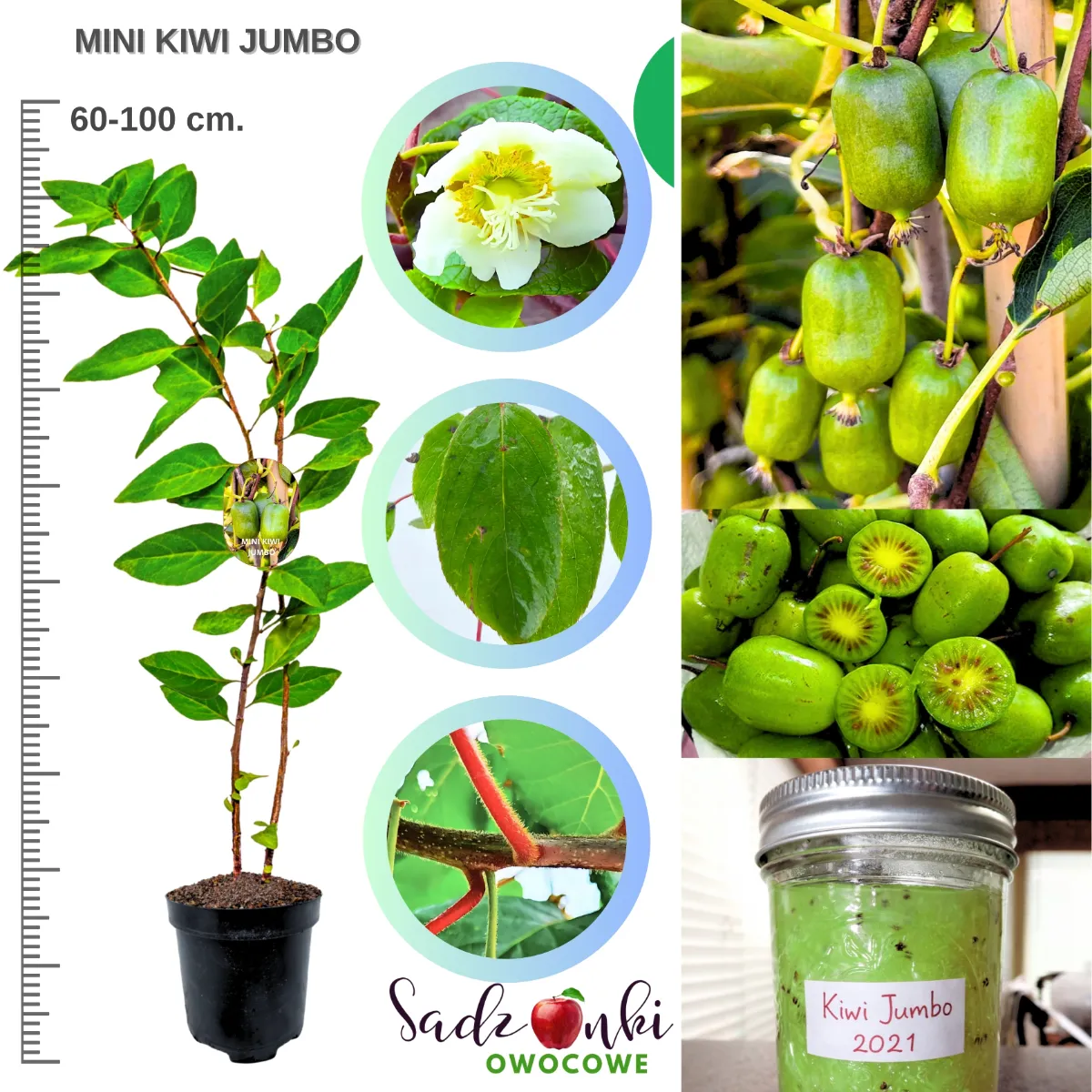 Sadzonki oferowane do nasadzeń mają zazwyczaj wysokość 20–30 cm lub 60–100 cm, co pozwala dobrać roślinę zarówno do młodych nasadzeń, jak i do szybszego zazielenienia przestrzeni. Już po kilku sezonach wzrostu Mini Kiwi Jumbo tworzy silne pędy i zaczyna pokrywać podpory gęstą zielenią.