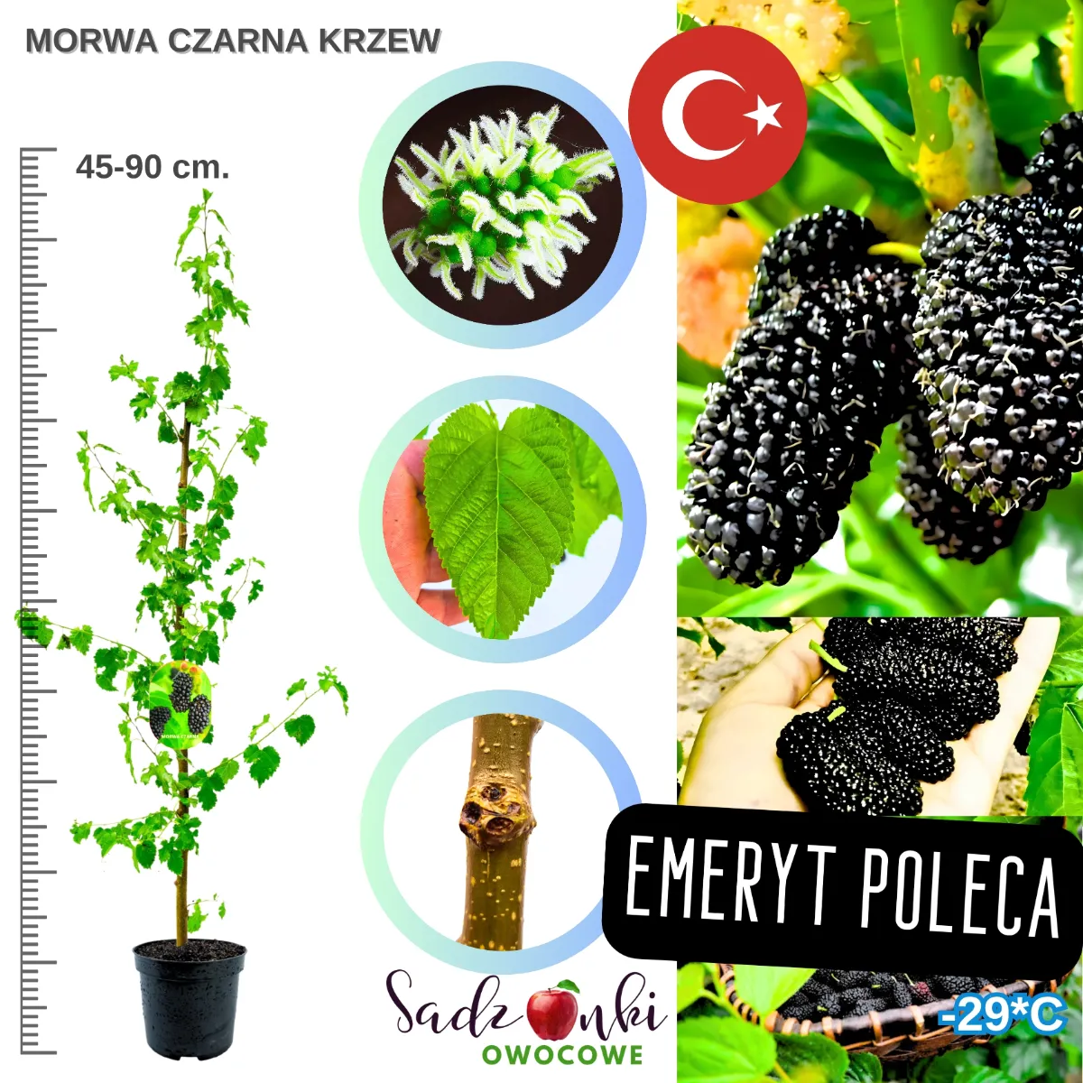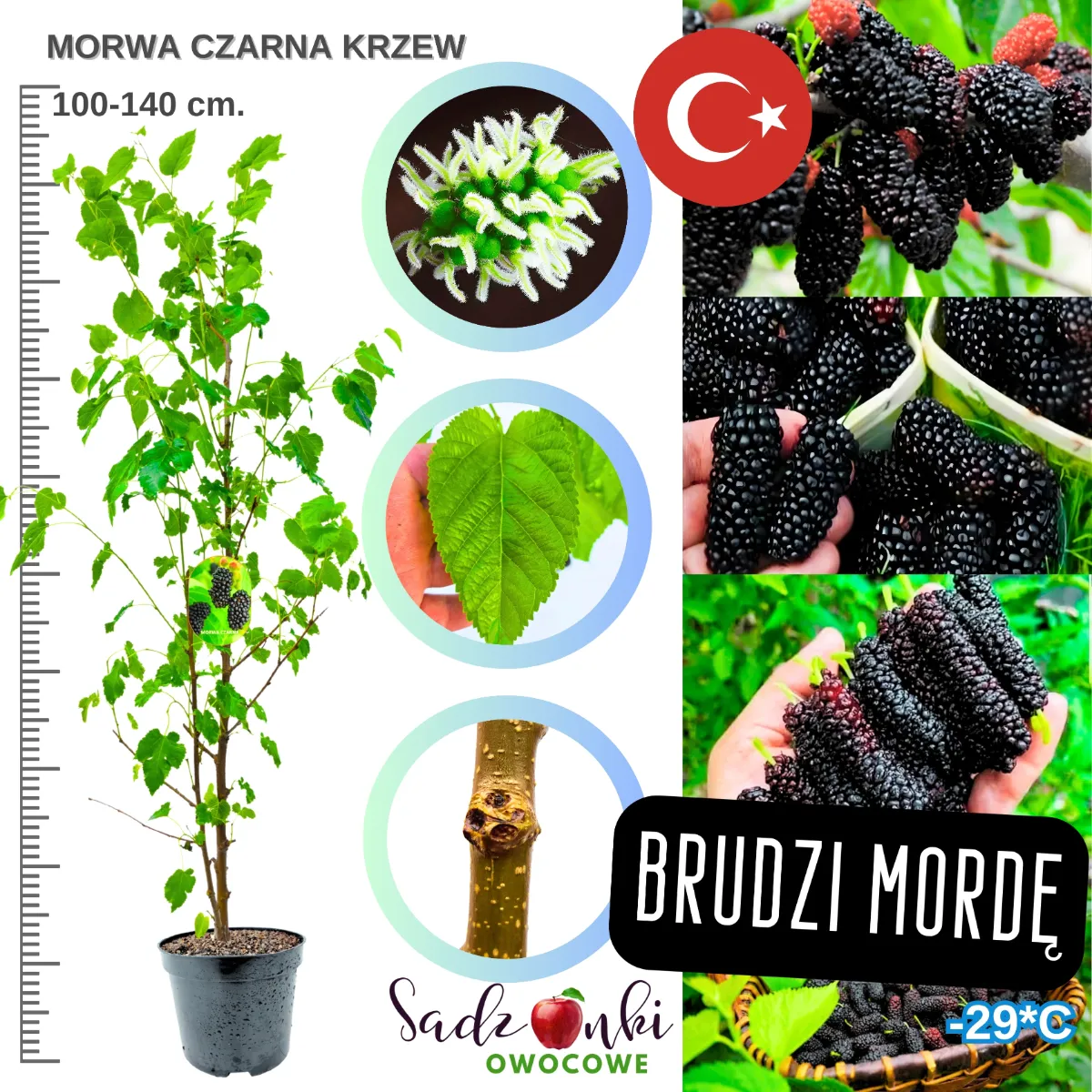 Zaskocz swoich znajomych i sąsiadów wyjątkową morwą czarną w swoim ogrodzie! Ta rzadziej spotykana odmiana nie tylko będzie oryginalnym akcentem w Twoim zielonym zakątku, ale również dostarczy całej rodzinie zdrowych, pełnych antyoksydantów owoców. Zdecyduj się na zakup naszej dorodnej sadzonki już dziś i dołącz do grona szczęśliwych posiadaczy tego niezwykłego drzewa, które przez dziesiątki lat będzie cieszyć oko i podniebienie. Pamiętaj, że morwa czarna to nie tylko inwestycja w piękny ogród, ale również w zdrowie Twoje i Twoich bliskich!