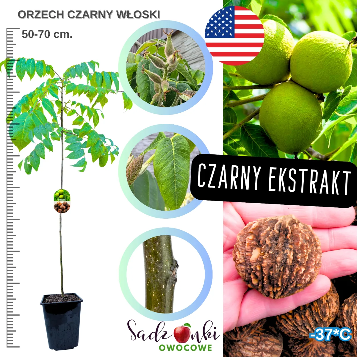 Kupując orzech czarny sadzonka, otrzymujesz młode drzewko przygotowane do sadzenia w gruncie. Sadzonki oferowane są w donicach, z dobrze rozwiniętą bryłą korzeniową, co pozwala na bezpieczne przyjęcie się rośliny po posadzeniu.