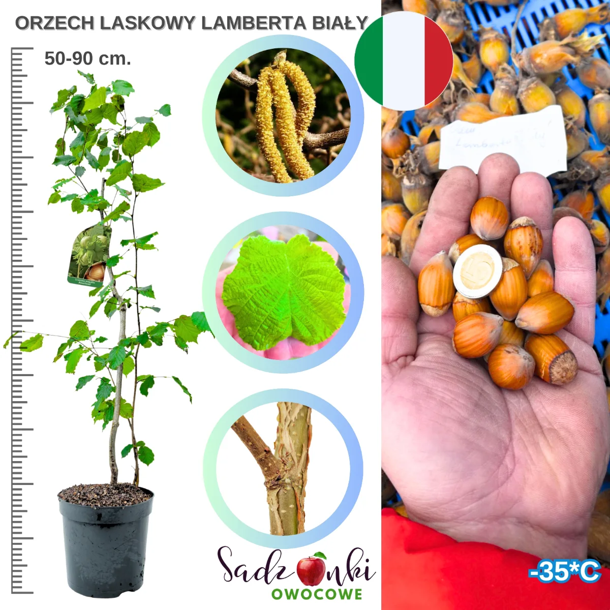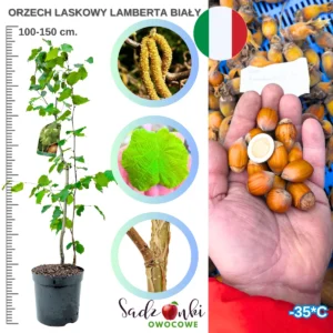 Orzech laskowy Lamberta biały to sprawdzona odmiana leszczyny polecana do uprawy w ogrodach przydomowych, na działkach oraz w niewielkich nasadzeniach użytkowych. Roślina dostępna jest jako sadzonka szkółkarska w doniczce, gotowa do wysyłki i sadzenia bezpośrednio po dostarczeniu. Dzięki wysokiej odporności na mróz sięgającej nawet –35°C dobrze radzi sobie w polskich warunkach klimatycznych, również w chłodniejszych rejonach kraju.