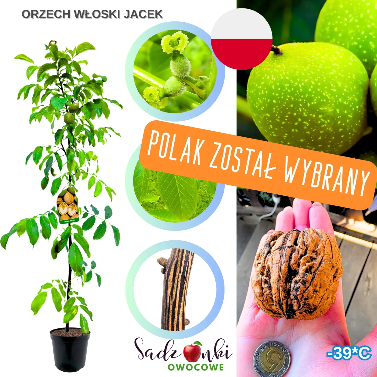 Decydując się na orzech włoski Jacek, sadzisz drzewo owocowe o przewidywalnym rozwoju i dużym potencjale plonowania. Roślina bardzo dobrze radzi sobie w warunkach klimatycznych Europy Środkowej i wykazuje wysoką mrozoodporność do około −39°C, co sprawia, że bez problemu zimuje w większości regionów Polski.