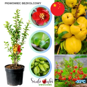 Pigwowiec bezkolcowy to krzew owocowy zaprojektowany pod maksymalną wygodę użytkowania i stabilne plonowanie w ogrodzie. Najważniejszą cechą tej odmiany jest całkowity brak kolców, co bezpośrednio wpływa na komfort zbioru owoców oraz wykonywania prac pielęgnacyjnych. W klasycznych odmianach kolce znacząco utrudniają dostęp do owoców i zwiększają ryzyko uszkodzeń dłoni – tutaj ten problem został wyeliminowany. Dzięki temu roślina bardzo dobrze sprawdza się w ogrodach przydomowych, na działkach oraz wszędzie tam, gdzie liczy się wygoda pracy i szybki dostęp do plonu.
