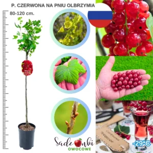 Oferowana porzeczka pienna Olbrzymia to sadzonka o wysokości 80–120 cm, przygotowana do dalszej uprawy w ogrodzie lub na działce. Roślina szybko się przyjmuje i już w kolejnych sezonach potrafi wytwarzać liczne grona owoców o intensywnym aromacie.