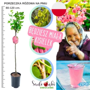 Sadzonka dostępna jest w wysokości 80–120 cm, co oznacza, że roślina już w momencie zakupu posiada wyraźnie uformowany pień oraz rozwiniętą koronę. Dzięki temu porzeczka różowa na pniu po posadzeniu szybko adaptuje się do stanowiska i w kolejnych sezonach zaczyna regularnie owocować.