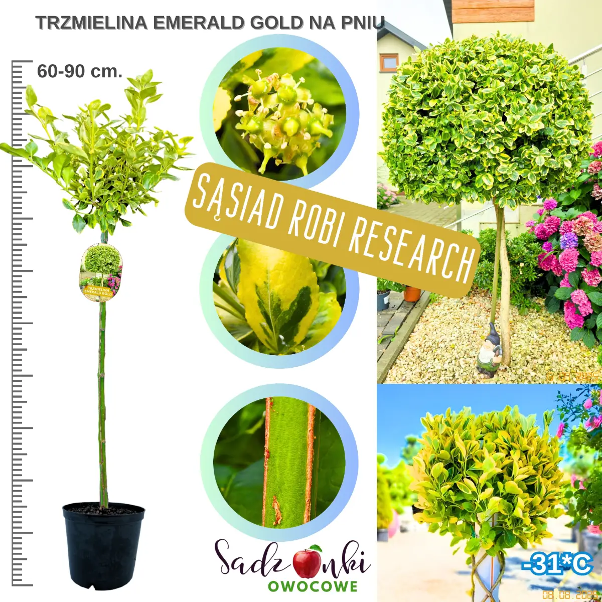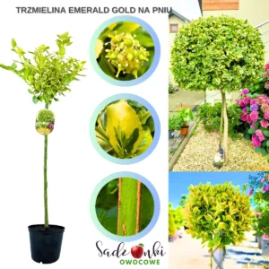 Trzmielina na pniu Emerald Gold to jedna z najbardziej efektownych odmian trzmieliny w formie dekoracyjnego drzewka. Dzięki szczepieniu na stabilnym pniu oraz intensywnie złotozielonym liściom stanowi wyjątkową ozdobę ogrodu, tarasu i balkonu. Roślina wyróżnia się regularnym pokrojem, wysoką odpornością oraz bardzo dobrą tolerancją na cięcie.